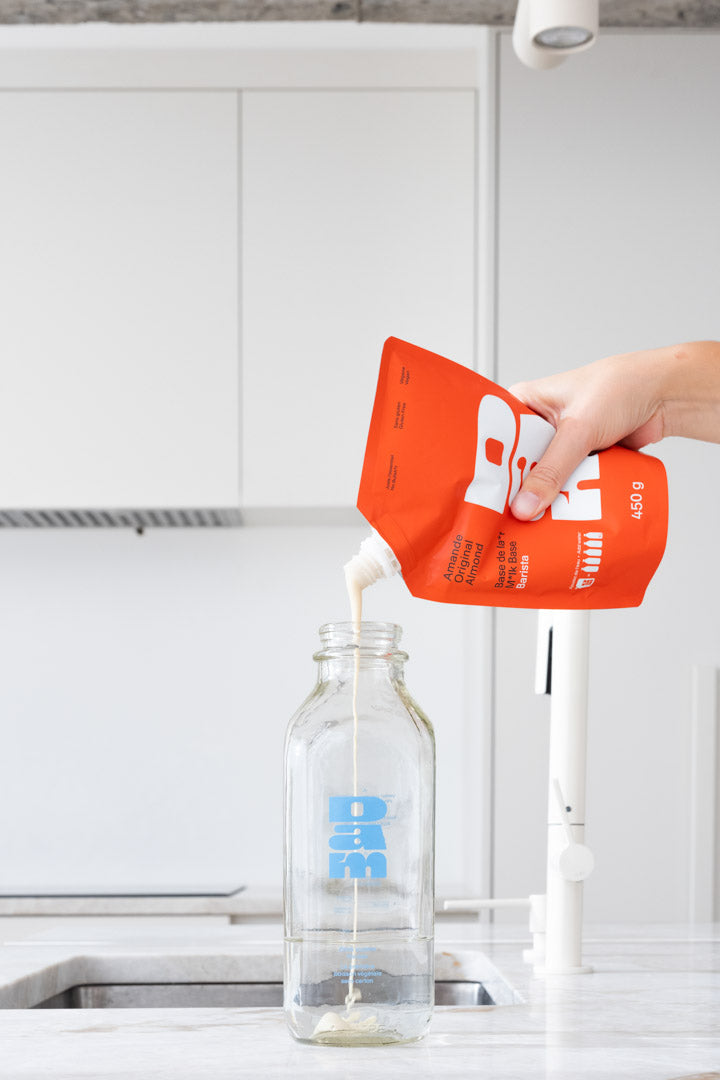 • Il suffit simplement de mélanger la base végétale Dam avec de l'eau pour obtenir un la*t fraichement préparé !