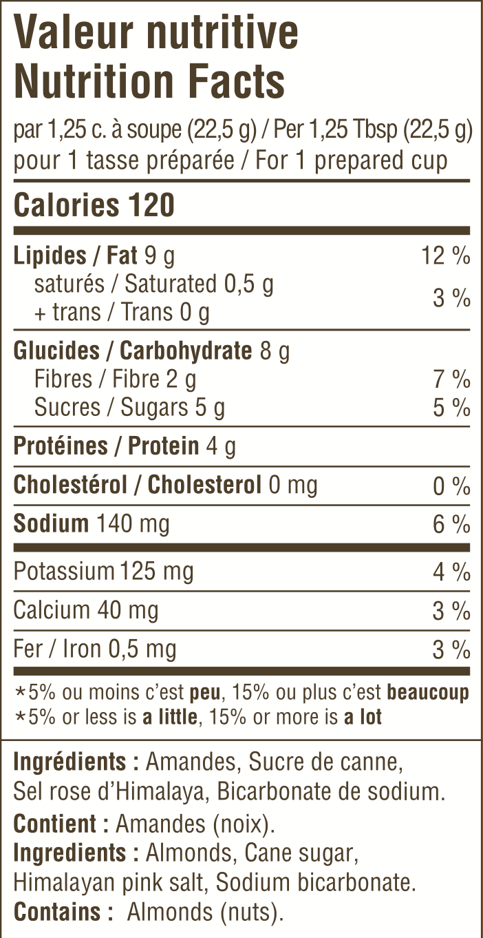 Amandes, Sucre de canne, Sel rose d’Himalaya, Bicarbonate de sodium.